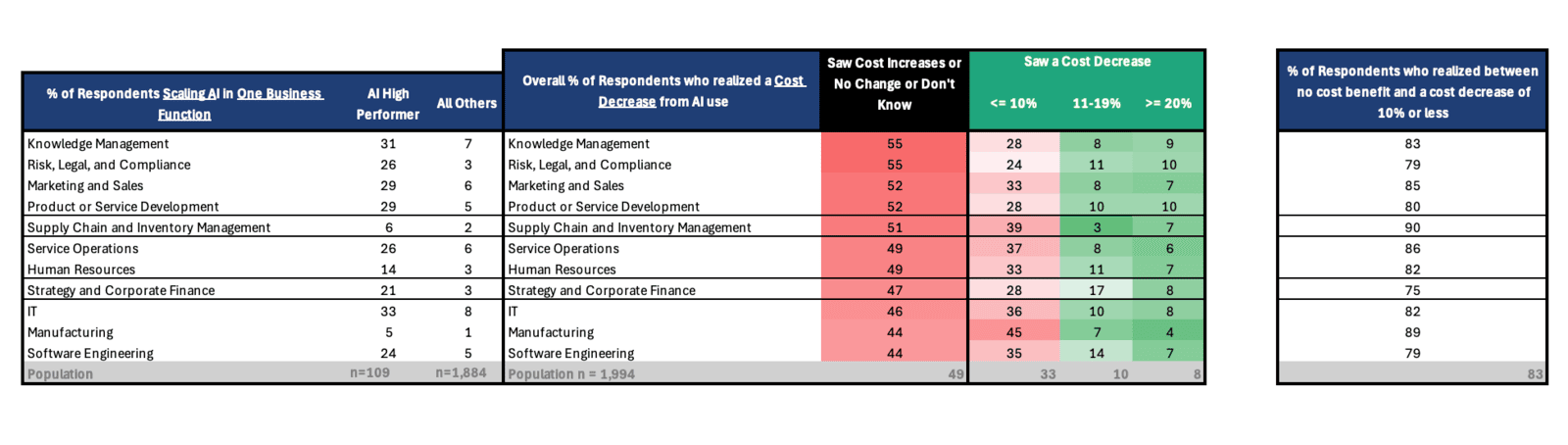 The data shows that most organizations have yet to unlock meaningful efficiency gains from AI see (Exhibit 1). In 2025, across all major business functions, roughly half of 1,994 respondents reported either higher costs, no change in cost savings, or an inability to quantify AI’s savings impact. About one-third saw cost benefits of 10% or less, 10% reported a cost benefit of 11-19%, and only 8% realized savings of 20% or more. When grouping the results into a single band, from no cost benefit up to 10% savings, more than 80% of respondents fall into this category.