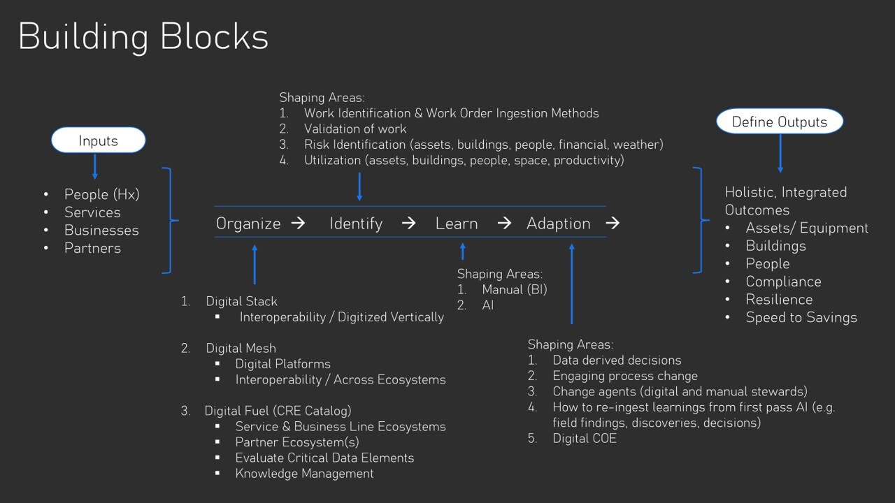 For organizations, unlocking the next wave of AI value starts with fixing the CRE foundation. Legacy structures with organizational silos, fragmented infrastructure ownership, inconsistent processes, and constrained resources cannot be solved by a “single AI solution”. Achieving outcomes like compliance, operational excellence, and resilience requires redesigning the full value chain – how inputs are organized and how they are translated into measurable performance. The outputs or outcomes sit on top of strong structural inputs such as integrated data from human experience, service operations, partner networks, contracts, and building level technology to name a few.